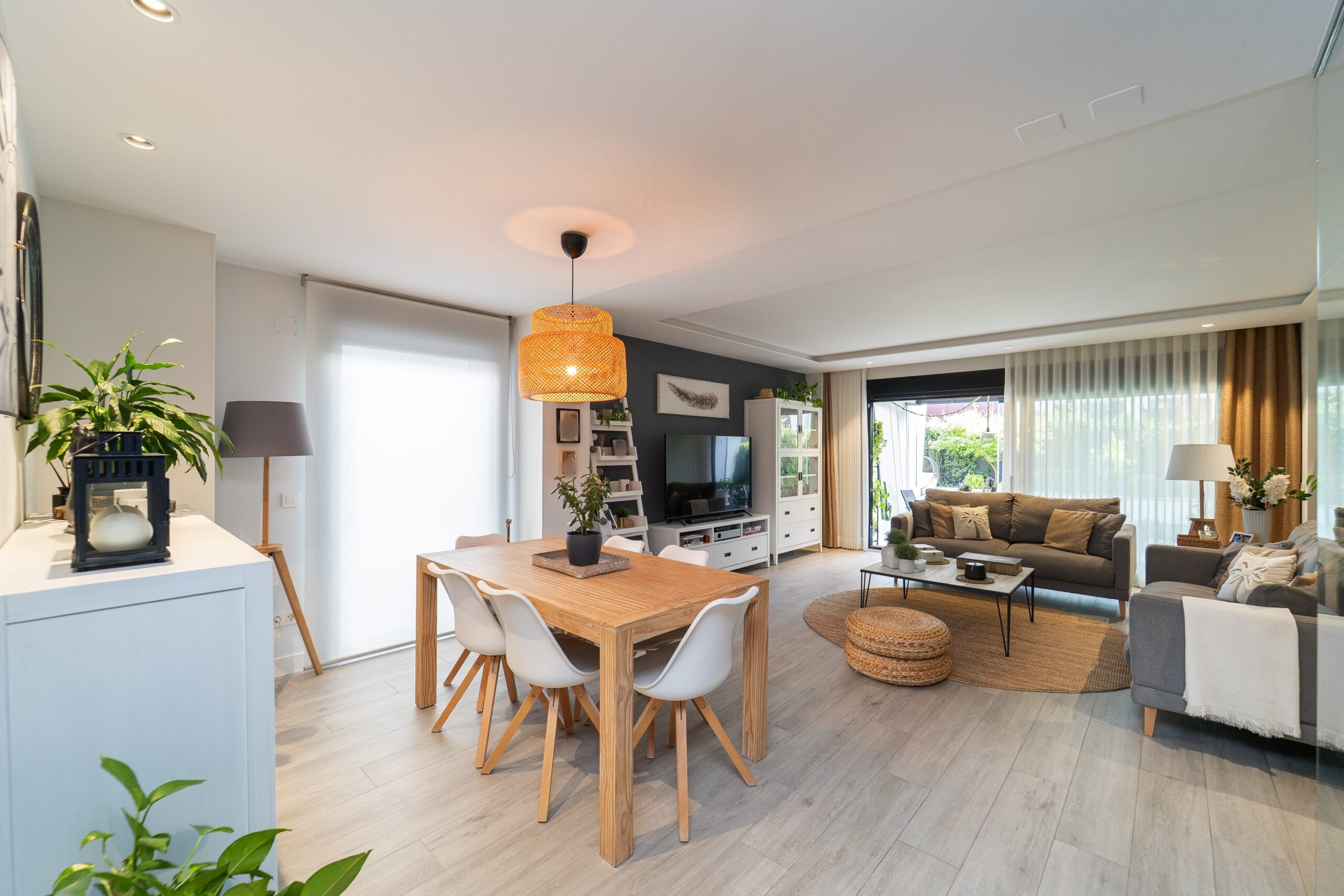 Al acceder, encontramos un amplio y luminoso hall de entrada que da paso a un espacioso salón-comedor, muy luminoso gracias a su gran ventanal. También contamos con salida directa al patio privado a través de un porche acristalado.