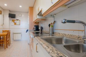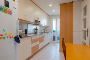Siguiendo el recorrido, accedemos a la cocina independiente, completamente equipada, con salida a un práctico patio-tendedero que ofrece gran capacidad de almacenaje.
