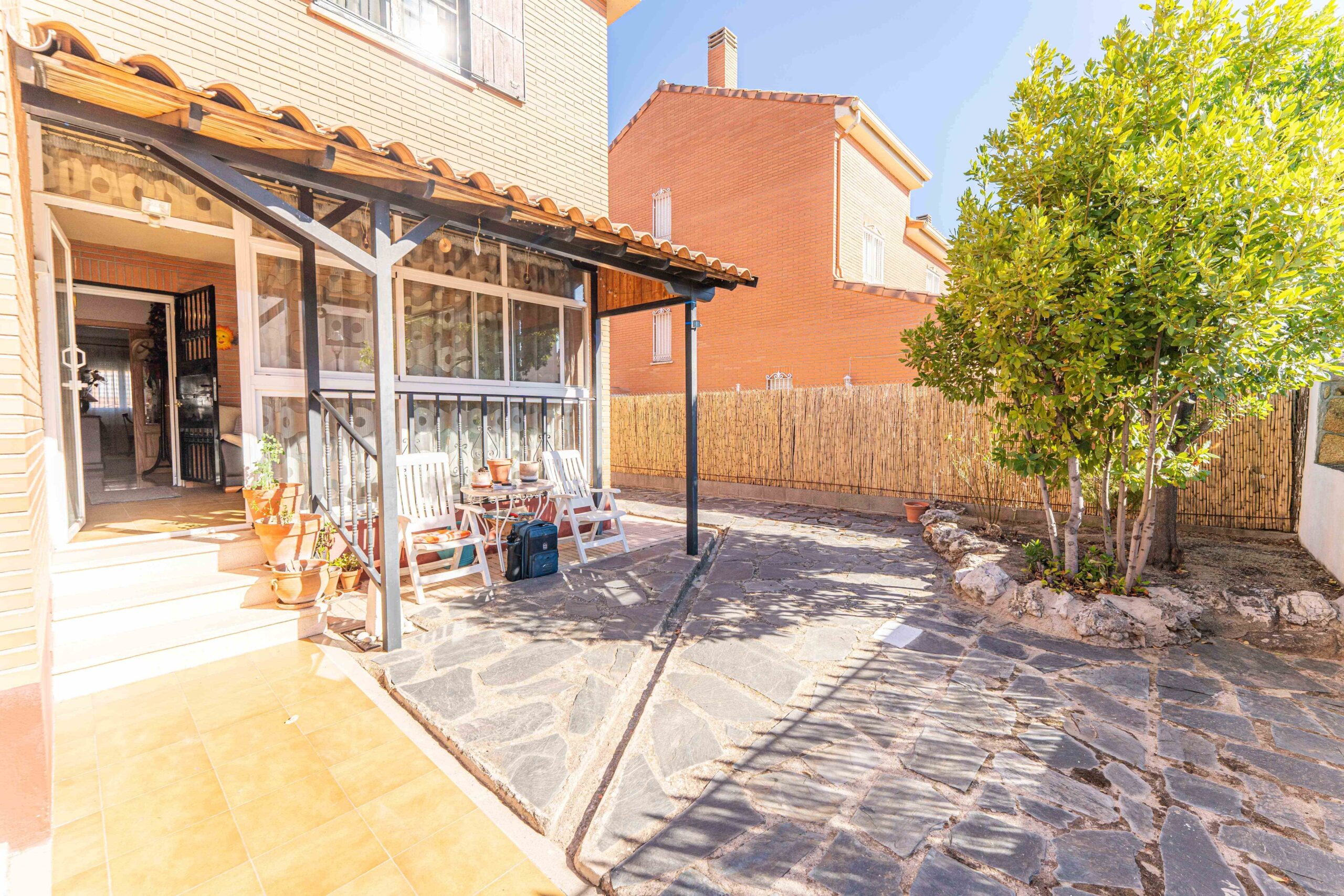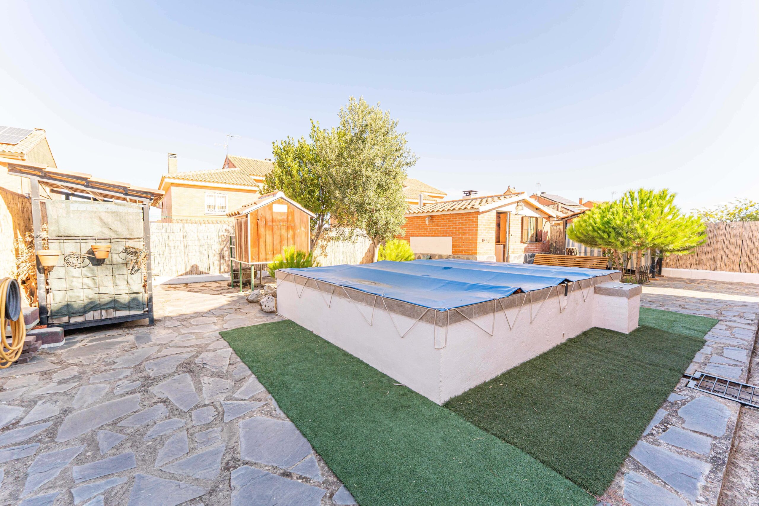 Al acceder a la parcela, nos encontramos con un amplio patio solado que dispone de una piscina, así como de una zona de barbacoa cubierta y un trastero también cubierto, que aportan comodidad y almacenaje adicional. El porche acristalado se convierte en un rincón muy especial, ideal como comedor exterior, zona de lectura o espacio de descanso con vistas al patio.