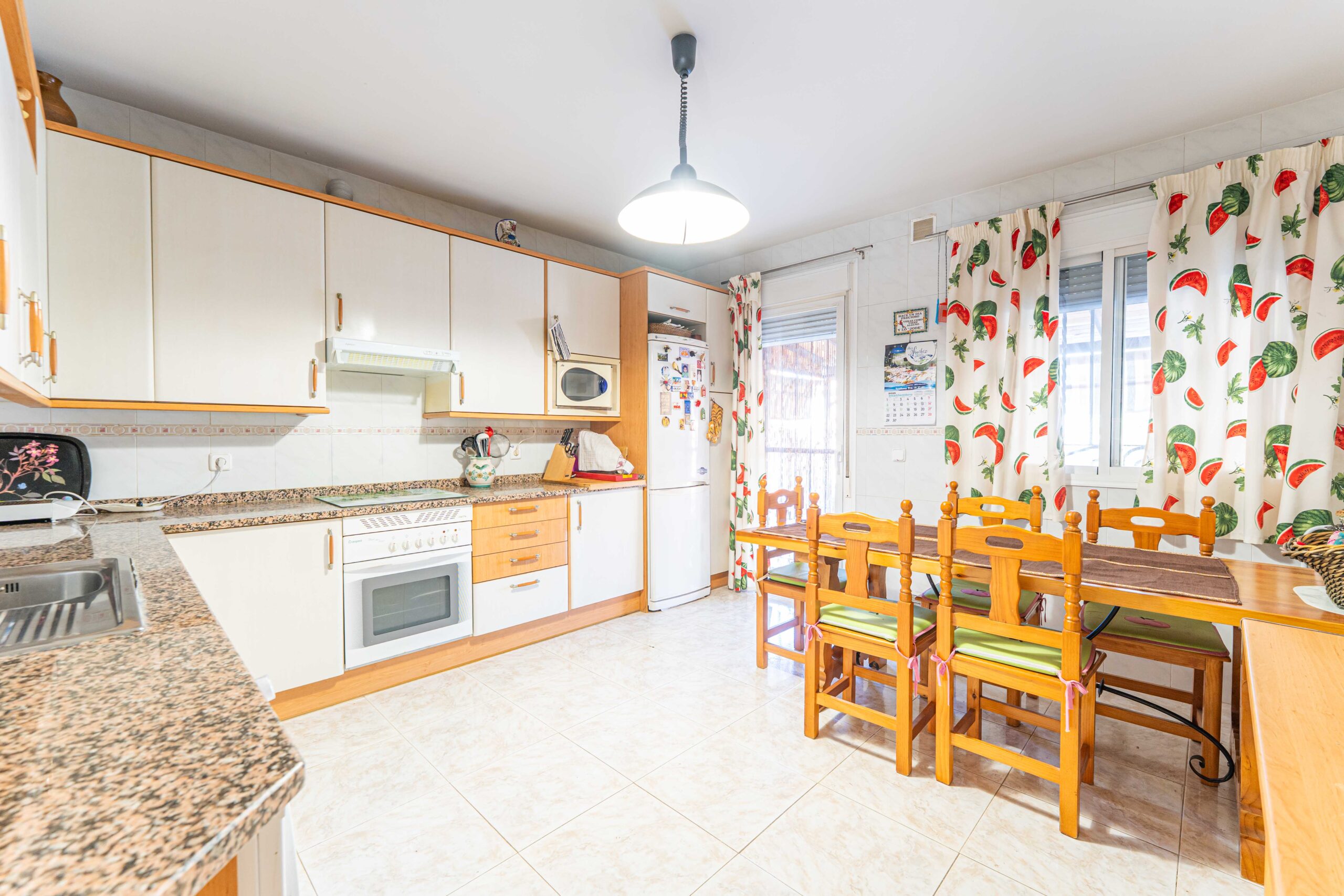 En la planta baja, la vivienda cuenta con un amplio y luminoso salón-comedor con chimenea funcional, que añade calidez en invierno y tiene salida directa al patio trasero. La cocina, cómoda y bien distribuida, también tiene acceso al exterior, lo que facilita el uso del espacio exterior para comidas al aire libre. En esta planta encontramos además un aseo con ventana, una práctica despensa bajo la escalera y el acceso al garaje cubierto.