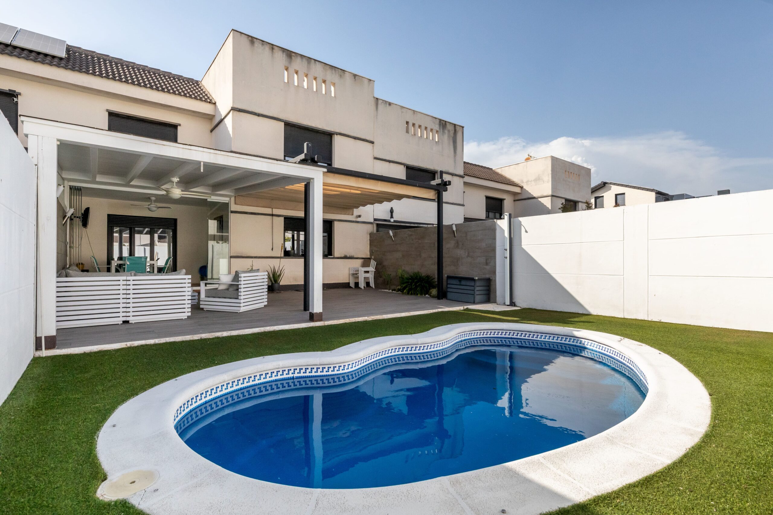 -En el jardín contamos con una maravillosa piscina, porche cenador y chillout que nos ofrece varias posibilidades para disfrutar al aire libre de nuestro espectacular jardín.